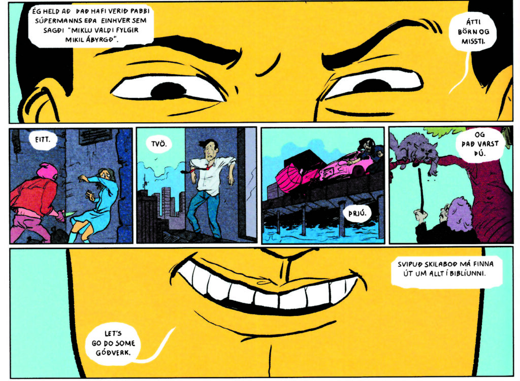Näyte Hugleikur Dagssonin ja Árni Jón Gunnarssonin Súperkúkur-kirjasta (2016), jota ei ole suomennettu.